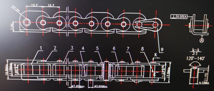 SD08AF1熱合機鏈條主要應用于熱合機設備上,通過鏈條頂部附件實現對接,熱合封口機工作流程:袋口清潔集塵(備選)→縫包機:外袋縫包→切刀斷線:修整袋口→熱熔膠帶(3.4.6組加熱塊加熱)→彈性壓輥壓合→完成