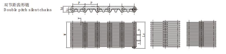 齒形鏈,雙節距齒形鏈,鏈條規格,鏈條型號,節距,鏈寬,銷軸直徑,銷軸長度,孔中心到齒尖距離,鏈板高度,鏈板厚度,導向型式,片數,抗拉強度,平均抗拉強度,每米長重
