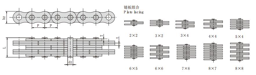 鏈號 節距 鏈板組合 鏈板高度 鏈板厚度 銷軸直徑 銷軸長度 抗拉強度 平均抗拉強度 每米重量