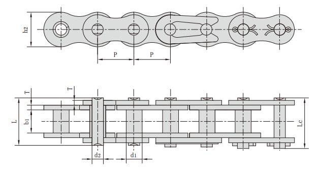 鏈號 節距 套筒直徑 內節內寬 銷軸直徑 銷軸長度 內鏈板高度 鏈板厚度 抗拉強度 平均抗拉強度 每米長重