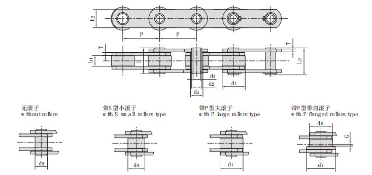 鏈號(hào) 節(jié)距 滾子尺寸 內(nèi)節(jié)內(nèi)寬 銷軸直徑 套筒直徑 銷軸長(zhǎng)度 鏈板厚度 鏈板高度 抗拉強(qiáng)度
