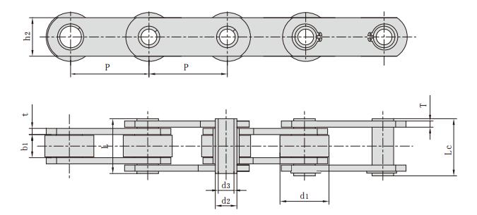 鏈號(hào) 節(jié)距 滾子直徑 內(nèi)節(jié)內(nèi)寬 銷軸直徑 銷軸長(zhǎng)度 內(nèi)鏈板高度 鏈板厚度 抗拉強(qiáng)度 平均抗拉強(qiáng)度 每米長(zhǎng)重