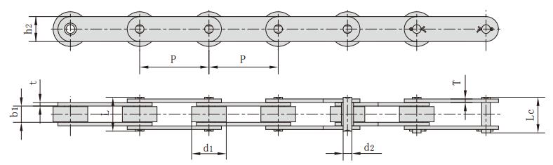 鏈號 節距 滾子直徑 內節內寬 銷軸直徑 銷軸長度 內鏈板高度 鏈板厚度 抗拉強度 平均抗拉強度 每米長重